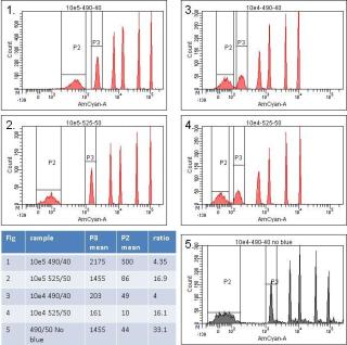 I used 6 peak beads and set the brightest bead to 10^5. Plot 1 shows the 490/40 filter, notice the high signal for the lowest peak, “P2”. Using a 525/50 to avoid the 488 region (plot 2) you can see the dimmest bead has much greater separation from the next peak “P3”, in fact 4 times the separation based on a ratio of the means. I repeated the measurements setting the brightest peak to 10e4 instead of 10e5, and while the difference is not as evident visually (plots 3 and 4), mathematically it is again a 4-fold difference.