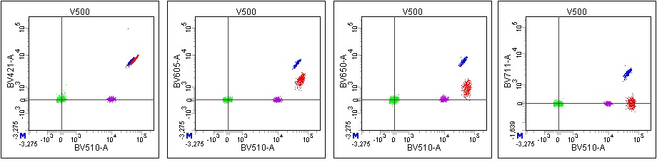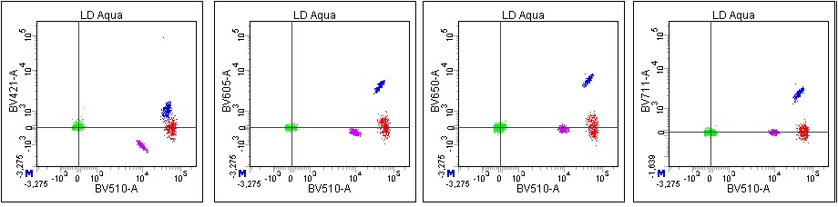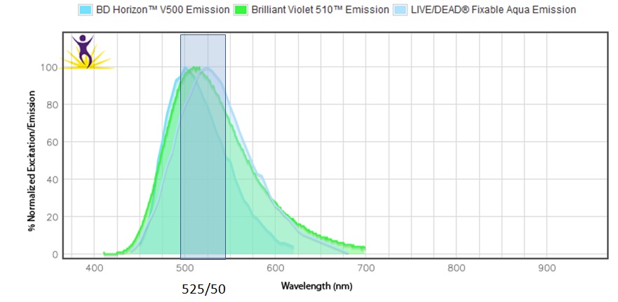 There persists a misconception that if things are measured in the same channel, they are the same color or “close enough”. The example that I’ll use to illustrate the potential problems with this was a panel that used BV510 and V500 as the labels for the dump channel markers, and Live/Dead Aqua for viability, which are all measured off of 405 excitation and a bandpass around 525/50. You can see in the image below that they are all slightly different: