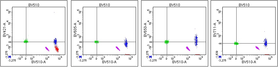 On our system, we have the following detectors on our violet laser. Shown are the uncompensated signals from the 3 different dyes on single stained beads.