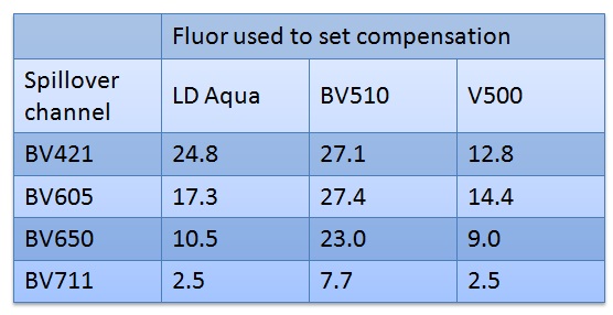 The cytometer has no way to tell WHICH dye is generating the signal, so it will not be able to correct the signals properly, but will just apply whatever values your matrix contains. The actual matrix values for the different dyes: