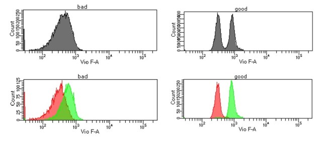 In spite of my choice of labels in this post, these filters are not necessarily “bad” or poorly made, they were simply made to certain specifications, such as reflection down to 488, and so may be unsuitable for use on violet or UV excitation lines, while perfectly fine for use on the red, blue or yellow-green lines. Without knowing the specific properties of the filters, it is easy for even an experienced cytometrist to swap in the “same” filter when changing a configuration and end up with different results.